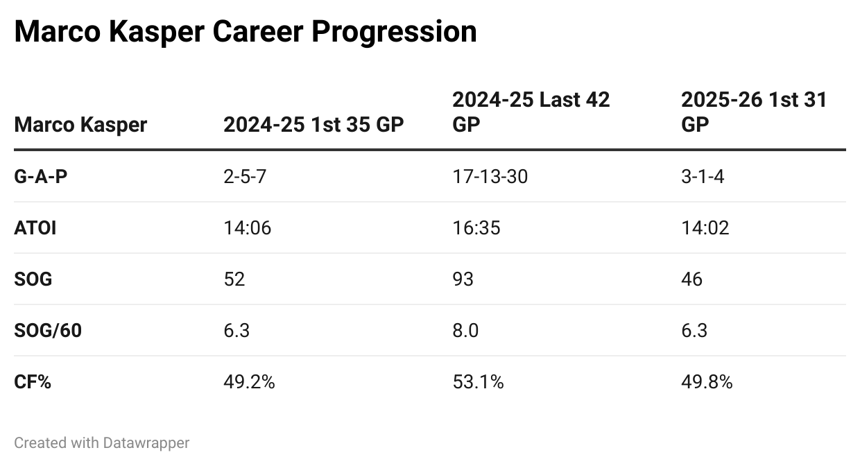 Isolating Kasper’s contributions as best as possible from an individual standpoint, here’s a look at a few rate stats in time crunches over the past two seasons, the first 35 games of his rookie year, the last 42 games of the same season and his 2025-26 performance to date.