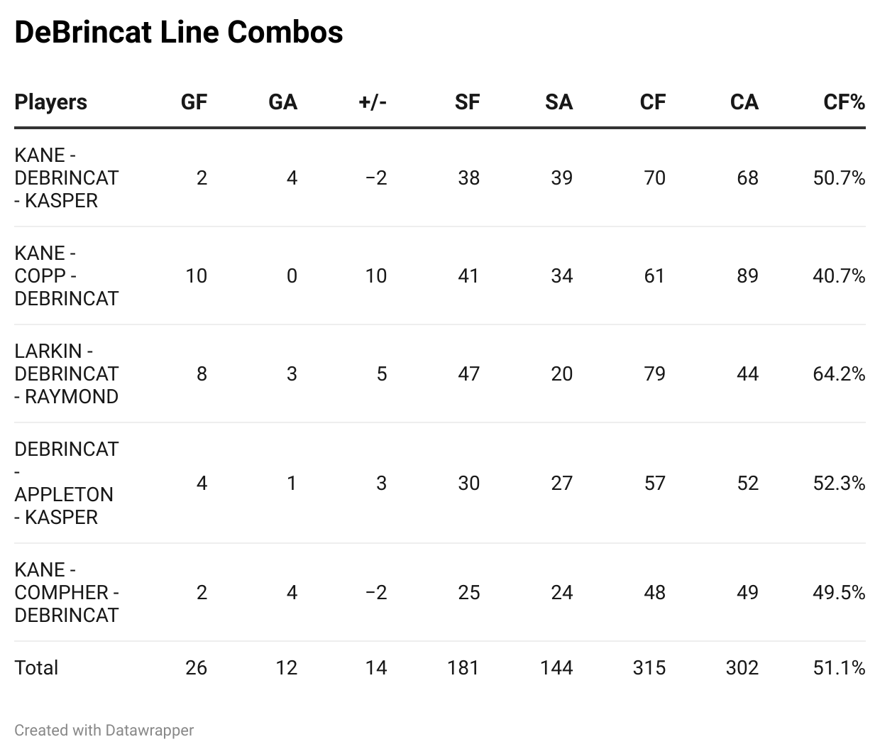 Last season, the line combination of Kasper, DeBrincat and Kane posted a Corsi% of 52.1% and outscored opponents, 9-4 at even-strength. While the possession metrics are a bit lower with that combination this year, it is still above 50 percent.