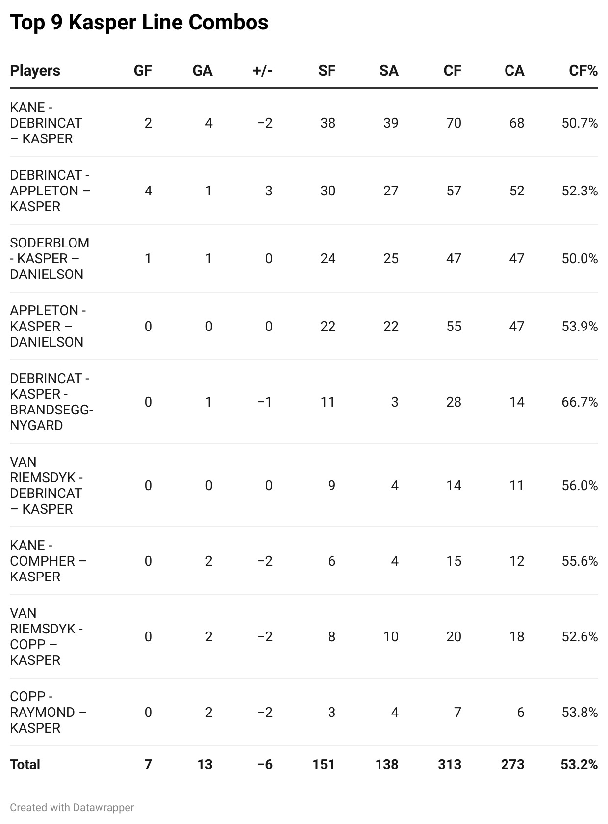 These nine combinations with Kasper have played roughly 293 minutes at 5-on-5 and average 30 shots on goal per 60 minutes and are +13 overall in shots on goal. All nine combinations are 50% Corsi or above. Yes, this includes several top six caliber forwards with Alex Debrincat accounting for four of nine groups, but it also includes long in tooth veterans like James van Riemsdyk, career grinders such as Mason Appleton and disappointing contracts like Andrew Copp and JT Compher with top winger Lucas Raymond appearing just once in this group. Anywhere you put Kasper, play tilts in the opponent’s end.